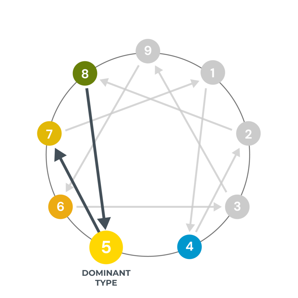 The Inner Flow growth path for Type Fives brings them into direct contact with the challenges embodied in Type Seven: using levity, sincere intellectual interest, innovative thinking, and creative options as a way of interacting more directly with the outside world. Consciously drawing on the natural strengths of the Seven archetype can help Fives see how they can engage more fully with others without having to disappear. While Fives can move to the Seven Point in times of stress, causing them to act out their nervousness in social situations through anxious laughter or a manic way of talking, they can work to ease this tension with awareness by consciously embodying aspects of the high side of Seven. Fives can expand their ability to share more of themselves with others by intentionally using humor, playfulness, and intellectual curiosity to help them to manage any anxiety they might feel when opening up more socially.
